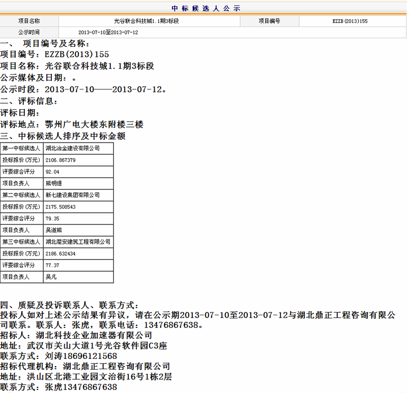 光谷聯合科技城1.1期3標中標候選人公示