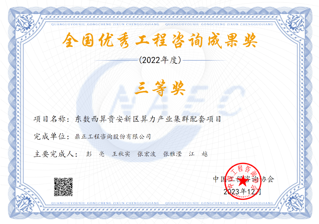 2023年12月29日,中國工程咨詢協(xié)會(huì)公布了“2022年度全國優(yōu)秀工程咨詢成果獎(jiǎng)”獲獎(jiǎng)項(xiàng)目名單,鼎正咨詢編制的《東數(shù)西算貴安新區(qū)算力立業(yè)集群配套項(xiàng)目》榮獲全國優(yōu)秀工程咨詢成果三等獎(jiǎng)。