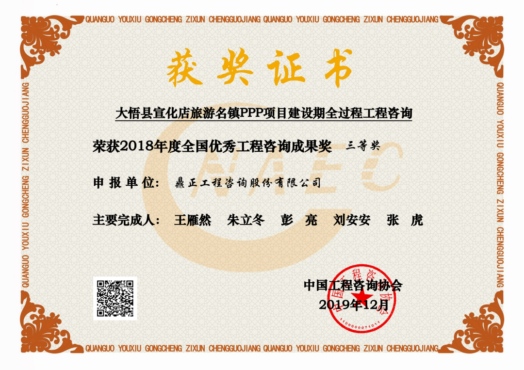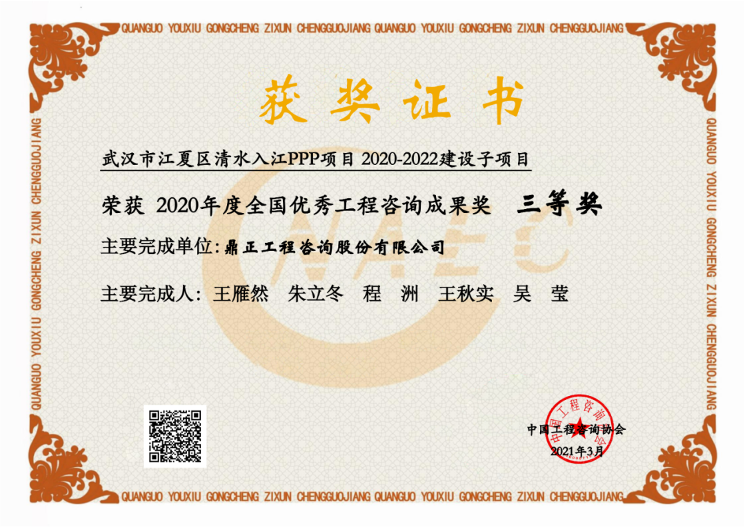 每兩年評(píng)選一次,2018-2019年,我司大悟縣宣化店旅游名鎮(zhèn)建設(shè)PPP項(xiàng)目首獲“全國優(yōu)秀工程咨詢成果獎(jiǎng)”榮譽(yù);2020-2021年,我司武漢市江夏區(qū)清水入江PPP項(xiàng)目再獲該獎(jiǎng);2022-2023年,我司東數(shù)西算貴安新區(qū)算力立業(yè)集群配套項(xiàng)目第三次獲得此殊榮。